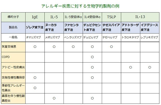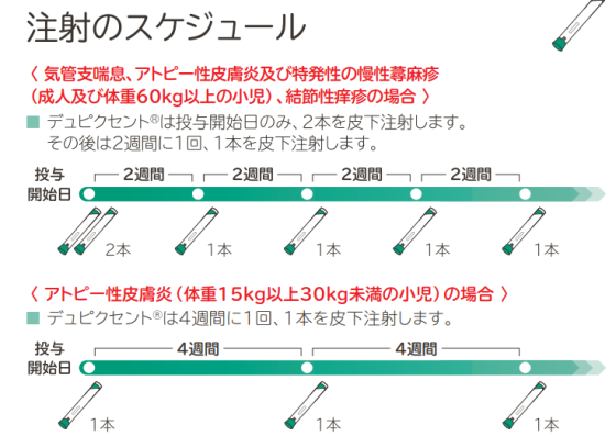 【特徴】 本剤は、「重症アトピー性皮膚炎の治療を大きく変えた」と言われるほどの画期的な薬剤です。 アトピー性皮膚炎や気管支喘息の治療薬として、2018年に日本で初めての抗体医薬として承認されましたが、その後、適応が拡大され、2023年6月には結節性痒疹、2024年2月には特発性の慢性蕁麻疹、さらに、2025年4月にはCOPDに対する適応が追加されました。 【承認状況】 〈アトピー性皮膚炎〉 我が国では、2018 年1 月に「既存治療で効果不十分なアトピー性皮膚炎」の適応で製造販売承認を取得し、2023 年9 月、生後6 カ月以上の小児に対する用法及び用量の追加承認、およびデュピクセント皮下注200mg シリンジの製造販売承認を取得しました。 〈気管支喘息〉 2019 年3 月には「気管支喘息(既存治療によっても喘息症状をコントロールできない重症又は難治の患者に限る)」の追加効能が承認されました。 〈鼻茸を伴う慢性副鼻腔炎〉 2020 年3 月には「鼻茸を伴う慢性副鼻腔炎(既存治療で効果不十分な患者に限る)」の追加効能が承認されました。 〈結節性痒疹〉 2023 年6 月に「既存治療で効果不十分な結節性痒疹」の追加効能が承認されました。 〈特発性の慢性蕁麻疹〉 2024 年2 月に「既存治療で効果不十分な特発性の慢性蕁麻疹」の追加効能が承認されました。 〈特発性の慢性蕁麻疹〉 2024 年2 月に「既存治療で効果不十分な特発性の慢性蕁麻疹」の追加効能が承認されました。 〈慢性閉塞性肺疾患〉 2025 年3 月に「慢性閉塞性肺疾患(既存治療で効果不十分な患者に限る)」の追加効能が承認されました。 【作用機序】 この薬は、ヒト型抗ヒトインターロイキン(IL)-4/13 受容体モノクローナル 抗体製剤と呼ばれる注射薬です。「IL-4」と「IL-13」というサイトカインの働きを直接抑えることで、アトピー性皮膚炎の病態や喘息の気道炎症、鼻茸を伴う慢性副鼻腔炎、慢性閉塞性肺疾患に関与する Type 2 炎症反応を抑制し、症状を改善します 【用法・用量】 〈アトピー性皮膚炎〉 成人には初回に600mgを皮下投与し、その後は 1 回300mgを 2 週間隔で皮下投与します。 〈結節性痒疹〉 成人には初回に600mgを皮下投与し、その後は 1 回300mgを 2 週間隔で皮下投与します。 〈特発性の慢性蕁麻疹〉 成人には初回に600mgを皮下投与し、その後は 1 回300mgを 2 週間隔で皮下投与します。 〈気管支喘息〉 成人及び12歳以上の小児には初回に600mgを皮下投与し、その後は 1 回300mgを 2 週間隔で皮下投与します。 〈慢性閉塞性肺疾患〉 成人には1 回300mgを 2 週間隔で皮下投与します。 〈鼻茸を伴う慢性副鼻腔炎〉 成人には1 回300mgを 2 週間隔で皮下投与します。なお、症状安定後には、1 回300mgを 4 週間隔で皮下投与できます。 【副作用】 重大な副作用として、重篤な過敏症が報告されています。また、主な副作用は、注射部位紅斑、結膜炎、口腔ヘルペス、アレルギー性結膜炎、好酸球増加症、注射部位反応、注射部位浮腫、頭痛、発疹、発熱、関節痛などが報告されています。 適応疾患で副作用報告は異なりますが、成人アトピー性皮膚炎患者を対象とした国際共同試験 3 試験で本剤 300 mg を 2 週に 1 回投与された 403 例(日本人 62 例を含む)において、副作用は 123 例に発現し、主な副作用は注射部位反応 29 例、頭痛 12 例、アレルギー性結膜炎 7 例でした(承認前)。