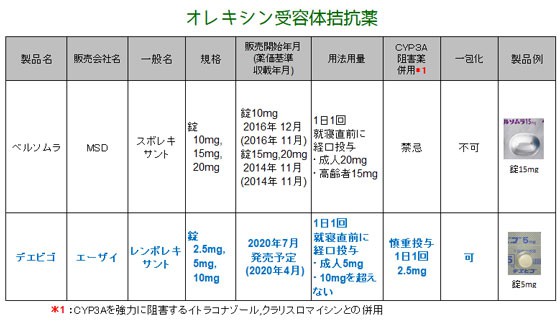 【薬剤師への注意】 1.肝薬物代謝酵素CYP3Aを中程度または強力に阻害する薬剤(イトラコナゾールなど)との併用は、禁忌ではありませんが、本薬の代謝が阻害され傾眠などの副作用が増強する可能性があります。 2.食後投与によりtmaxが遅延しCmaxが低下することから、食直後を避け、就寝直前に服用することになっています。 3.薬局ヒヤリハット事例の「共有すべき事例2021年No4」が2021年5月に公開されました。 http://www.yakkyoku-hiyari.jcqhc.or.jp/pdf/sharing_case_2021_04.pdf この事例2では、CYP3Aを強く阻害するクラリスロマイシン錠とスボレキサント錠での「併用禁忌」の処方について疑義照会し、本剤に変更して禁忌を回避したということです。ただし【用法・用量】に記載のとおり、本剤を2.5mgに制限する必要があります。 【患者さんへの指導例】 1.本剤は、覚醒と睡眠リズムを調整することで寝つきをよくし、より正常な睡眠の維持を促します。 2.このお薬は、食直後を避け、就寝直前に服用してください。入眠後、一時的に起床して活動する必要がある日には服用しないでください。 3.眠気や注意力・集中力・反射運動能力の低下など、薬の影響が翌朝以降も続くことがありますので、自動車の運転など危険を伴う機械の操作は行わないようにしてください。 不眠症の改善は、適度な運動を心掛けるなど、生活習慣を見直すことも大切です。起床時間と就寝時間を一定にし、睡眠リズムを整えましょう。 【ここがポイント!】 不眠症治療の中心的薬剤として、ベンゾジアゼピン系薬剤が長年使用されていますが、長期服用時の依存形成や薬物の不適正使用が問題となっています。近年では、より自然に近い睡眠・覚醒リズムを整える薬剤として、2010年にはメラトニン受容体作動薬のラメルテオン(商品名:ロゼレム)、2014年にはオレキシン受容体拮抗薬のスボレキサント(同:ベルソムラ)が発売されました。 本剤は、国内で2番目のオレキシン受容体拮抗薬で、オレキシン神経伝達に作用して過剰な覚醒状態を抑制するため、より自然な睡眠を促し、中途覚醒時間を短縮することが可能と考えられています。 本剤の特徴として、年齢による用量の制限がなく、また調剤時の一包化が可能となっているため、高齢者にも比較的使用しやすい薬剤といえるでしょう。第III相試験においては、入眠と睡眠維持の両方の改善を示し、プラセボと比較して翌日のふらつきや記憶力において問題となる悪化は認められず、日中機能の改善が確認され、6ヵ月投与した中止後の離脱症状は見られませんでした。 なお、【用法・用量】に記載のとおり、相互作用については禁忌ではないものの、肝薬物代謝酵素CYP3Aを中程度または強力に阻害する薬剤と併用する場合には、本剤の投与量を1日1回2.5mgに制限する必要があります。また、中等度肝機能障害の患者に対しては、本剤の血中濃度が上昇する可能性があるため、1日1回5mgが上限となっています。 医薬品リスク管理計画書(RMP)における本剤の潜在的リスクとして、ナルコレプシー症状が挙げられています。副作用については、日中の過剰な眠気、睡眠時麻痺、入眠時幻覚がないかなど、細やかな聞き取りを心掛けましょう。 | ||