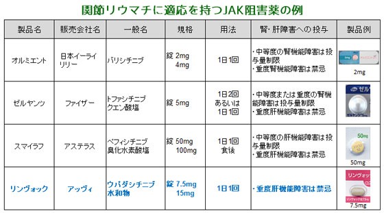 【薬剤師への注意】 1.敗血症等の重篤な感染症の患者や活動性結核の患者には、症状を悪化させるおそれがあるため、禁忌です。 2.重度の肝機能障害を有する患者には、副作用が強くあらわれるおそれがあるため、禁忌です。 【患者さんへの指導例】 1.この薬はJAKという酵素を強く阻害することで、関節リウマチなどの症状を改善します。 2.薬の成分が少しずつ出るようにコーティングされているので、かみ砕かないでください。 3.本剤の服用を長期間続けると、免疫力が低下する可能性があります。持続する発熱やのどの痛み、息切れ、咳、倦怠感、水疱、痛みを伴う皮疹などが現れた場合は、すぐにご連絡ください。 4.この薬を服用している間は、生ワクチン(麻疹、風疹、おたふく風邪、水痘・帯状疱疹、BCGなど)の接種ができません。接種の必要がある場合は主治医に相談してください。 5.(妊娠可能年齢の女性の場合)この薬を服用中および最終服用後一定の期間は、適切な避妊を行ってください。なお、国内治験においては、最終投与から30日まで避妊を行うよう定められていました。 【ここがポイント!】 関節リウマチの薬物療法は近年大きく進展しています。通常、発症初期はMTXをはじめとする従来型合成疾患修飾性抗リウマチ薬(csDMARD)が使用されますが、十分量用いても効果が不十分な場合には、生物学的製剤、もしくは本剤のようなJAK阻害薬が選択されます。 本剤は、関節リウマチに適応を持つ4番目のJAK阻害薬です。JAKには4種類のサブタイプ(JAK1、JAK2、JAK3、Tyk2)があり、本剤は炎症性サイトカインシグナルの伝達においてとくに重要な役割を持つJAK1を強く阻害することで、TNFαやIL-6の働きを遮断し、炎症性サイトカインの産生を抑制すると考えられています。 本剤は、MTXで効果不十分な関節リウマチ患者を対象とした第III相無作為化二重盲検比較試験で、12週時のACR50改善率、患者による疼痛評価およびHAQ-DIのベースラインからの変化量において、ヒト型抗ヒトTNFαモノクローナル抗体製剤アダリムマブ(商品名:ヒュミラ)に対する優越性が示されました。また、ウパダシチニブ+MTX群では、プラセボ+MTX群およびアダリムマブ+MTX群と比較して、有意に高い臨床的寛解達成率が示されました。 安全性に関する留意事項としては、警告欄で結核、肺炎などの重篤な感染症について注意喚起されています。また、トファシチニブ(同:ゼルヤンツ)、ペフィシチニブ(同:スマイラフ)と同様に、重度の肝機能障害患者には禁忌となっています。 本剤は徐放性フィルムコーティング錠であり、調剤時に半割・粉砕することはできません。患者に対しても、割ったりかみ砕いたりしないように伝えましょう。 | ||