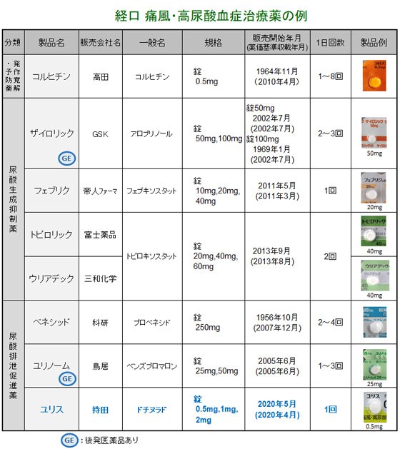 【特徴】 本剤は、尿酸トランスポーター1(URAT1)を選択的に阻害することで、尿酸の尿中排泄を促進し、血中尿酸値を低下させます。肝障害のリスクが少なく、腎機能低下患者にも使用しやすい尿酸排泄型の痛風・高尿酸血症治療薬です。 【承認状況】 海外では、2019年8月に米国で承認されました。 【作用機序】 尿酸分泌経路にはABCG2、OAT1、OAT3がありますが、本剤はこれらの経路を阻害することなく近位尿細管のURAT1を阻害することで、尿酸の再吸収を抑え、尿酸を排泄させ血中尿酸値を低下させる働きがあり、選択的尿酸再吸収阻害薬(SURI:Selective Urate Reabsorption Inhibitor)と呼ばれます。 【用法・用量】 通常、成人にはドチヌラドとして0.5mgを1日1回経口投与で開始し、その後は血中尿酸値を確認しながら必要に応じて徐々に増量します。維持量は通常1日1回2mgですが、患者の状態に応じて1日1回4mgを超えない範囲で適宜増減できます。 なお、尿酸降下薬による治療初期には、血中尿酸値の急激な低下により痛風関節炎(痛風発作)が誘発されることがあるので、増量する際は、投与開始から2週間以降に1日1回1mg、投与開始から6週間以降に1日1回2mgとするなど徐々に行い、増量後は経過を十分に観察する必要があります。 【副作用】 痛風を含む高尿酸血症患者を対象とした第III相試験において、本剤が投与された531例中104例(19.6%)に臨床検査値異常を含む副作用が認められました。主な副作用は、痛風性関節炎51例(9.6%)、関節炎11例(2.1%)、四肢不快感8例(1.5%)などでした(承認時)。 | ||