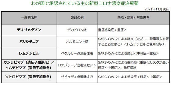【特徴】 本剤は、重症化リスクを有する軽症~中等症の新型コロナウイルス感染症(COVID-19)患者に対して重症化を防ぐことが期待されています。ただし、臨床試験における主な投与経験を踏まえ、COVID-19の重症化リスク因子を有し、酸素投与を要しない患者を対象に投与を行います。なお、本剤の中和活性が低いSARS-CoV-2変異株に対しては有効性が期待できない可能性があります。 【承認状況】 米国では2021年5月に本剤の緊急使用許可が取得され、オーストラリアでは2021年8月20日に承認を取得されました。 【作用機序】 COVID-19の原因となるSARS-CoV-2は、その表面に存在するスパイクタンパク質(Sタンパク質)が宿主細胞表面の酵素に結合することで宿主細胞に侵入し、感染に至ります。本剤は、このSタンパク質と宿主細胞表面の酵素との結合を阻害し、宿主細胞への侵入を阻害することでウイルスの増殖を抑制します。 【用法・用量】 通常、成人および12歳以上かつ体重40kg以上の小児には、ソトロビマブ(遺伝子組換え)として500mgを単回点滴静注します。COVID-19の症状が発現してから1週間程度までを目安に速やかに投与します。 なお、アナフィラキシーを含む重篤な過敏症が現れることがあるため、本剤投与中はアナフィラキシーショック、アナフィラキシーに対する適切な薬物治療(アドレナリン、副腎皮質ステロイド薬、抗ヒスタミン薬など)や緊急処置を直ちに実施できる環境を整え、投与終了後は症状がないことを確認します。 【副作用】 海外第II/III相試験(COMET-ICE試験)において、本剤投与群523例中、副作用発現数は8例(2%)でした。報告された副作用は、臨床検査値異常2件、発疹、皮膚反応、悪心、注入部位疼痛、疼痛、味覚不全、頭痛、不眠症がそれぞれ1件でした。 なお、重大な副作用として、アナフィラキシーを含む重篤な過敏症、infusion reactionが現れることがあります。 | ||