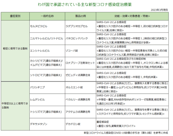 【特徴】 本剤は外来でも使用可能な経口剤であり、新型コロナウイルス感染症(COVID-19)の重症化を防ぐとされています。 【承認状況】 本剤は、わが国で特例承認されたものであり、承認時における有効性、安全性、品質に係る情報は限られているため、引き続き情報を収集する必要があります。そのため、本剤の使用にあたっては、あらかじめ患者又は代諾者に、その旨並びに有効性及び安全性に関する情報を十分に説明し、文書による同意を得てから投与することになっています。 【作用機序】 本剤の活性代謝物がRNA依存性RNAポリメラーゼを選択的に阻害することにより、ウイルスの増殖を抑えます。 【用法・用量】 通常、18歳以上の患者には、モルヌピラビルとして1回800mg(4カプセル)を1日2回、5日間経口投与します。COVID-19の症状が発現してから速やかに投与を開始する必要があります。 【副作用】 重症化リスクのある非重症COVID-19患者を対象に本剤またはプラセボを投与した多施設共同第III相試験の中間解析において、プラセボ群の重症化(29日目までの入院・死亡)が377例中53例(14.1%)であったのに対し、本剤群では385例中28例(7.3%)と、相対的リスクが48%減少しました(p=0.0012)。 なお、臨床試験において有効性が確認されたのは発症から5日以内に投与を開始した感染者であり、6日目以降における有効性のデータは得られていません。 副作用としては、下痢、悪心・嘔吐、浮動性めまい、頭痛が発現率1%以上5%未満で報告され、重要な潜在的リスクには、骨髄抑制および催奇形性が示されています。動物実験で催奇形性が認められており、妊娠しているまたは妊娠している可能性のある女性には投与できません。 | ||