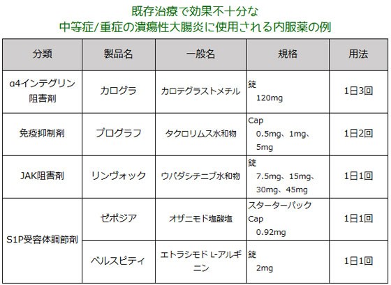 ![]() 中等症から重症の潰瘍性大腸炎に対して使用できる内服薬として、類似の既存薬としてはS1P受容体調節薬の、ゼポジアカプセルスターターパック/ゼポジアカプセル(オザニモド塩酸塩)があります。 この他、リンヴォック錠(ウパダシチニブ水和物)、ジセレカ錠(フィルゴチニブマレイン酸塩)などのJAK阻害薬、カログラ錠(カロテグラストメチル)、プログラフCap(タクロリムス水和物)などがあります。 なお、S1P受容体調節薬としては、適応が異なりますが、多発性硬化症に対してメーゼント錠(シポニモド フマル酸)が2020年6月に承認、2020年9月から販売されています。 その他の潰瘍性大腸炎治療薬としては、5-アミノサリチル酸製剤(メサラジン、サラゾピリン)、ステロイド(プレドニゾロン、ブデソニド)、免疫調節薬(アザチオプリン、6-メルカプトプリン)、抗TNF-α抗体製剤(インフリキシマブ、アダリムマブ、ゴリムマブ)、抗α4β7インテグリン抗体製剤(ベドリズマブ)、抗IL-12/23p40モノクローナル抗体(ウステキヌマブ)などがあげられます。 | ||